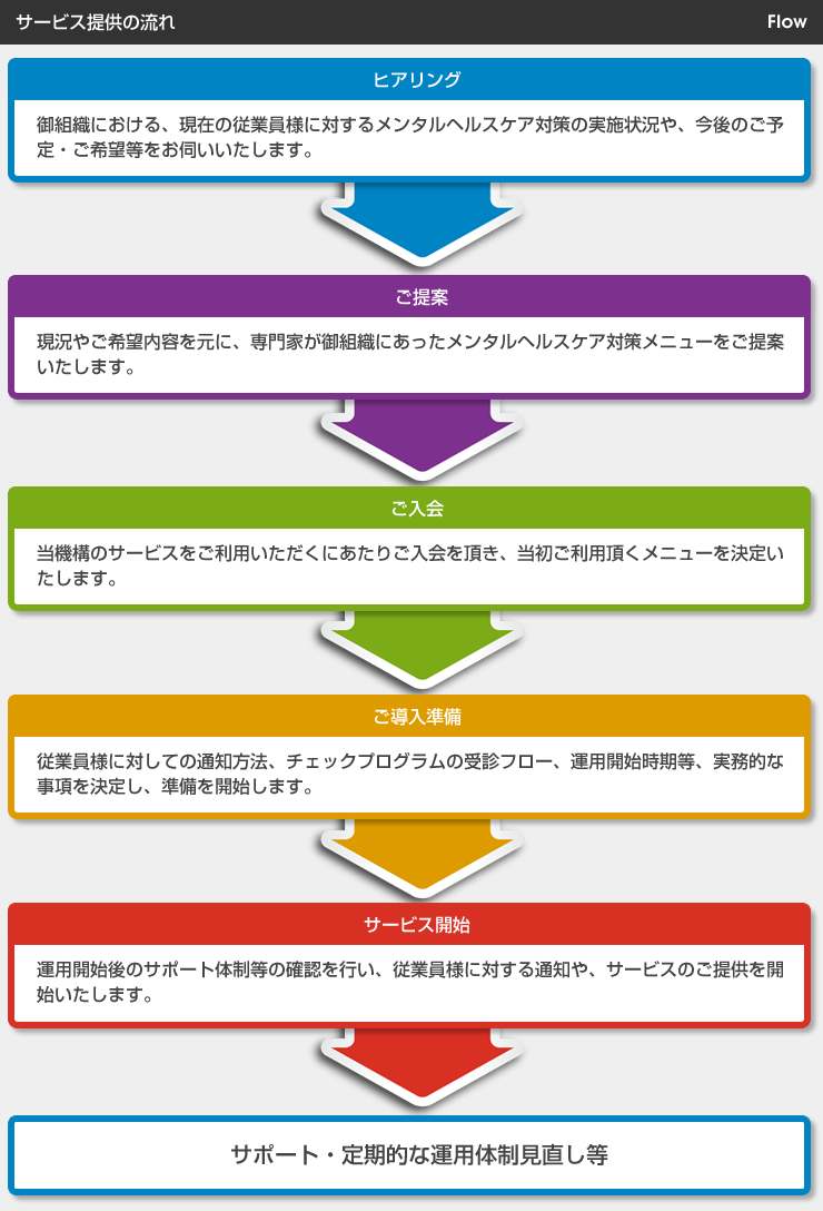 当機構のサービス サービス提供の流れ 導入事例 ご入会案内 メンタル機構概要 アクセス お問合せ